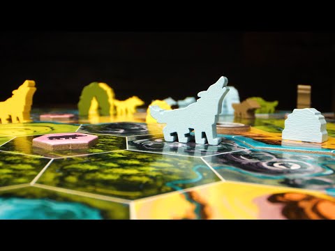 A clever action-selection mechanism drives your choices. Each action requires you to flip terrain tiles matching the terrain where you wish to take your action. These double-sided tiles mean the actions you take this round will set up which terrain types you can act on in the next round. As you take actions to expand your pack’s control of each region, you will also upgrade your pack’s attributes, allowing you to take more aggressive actions as the game goes on.